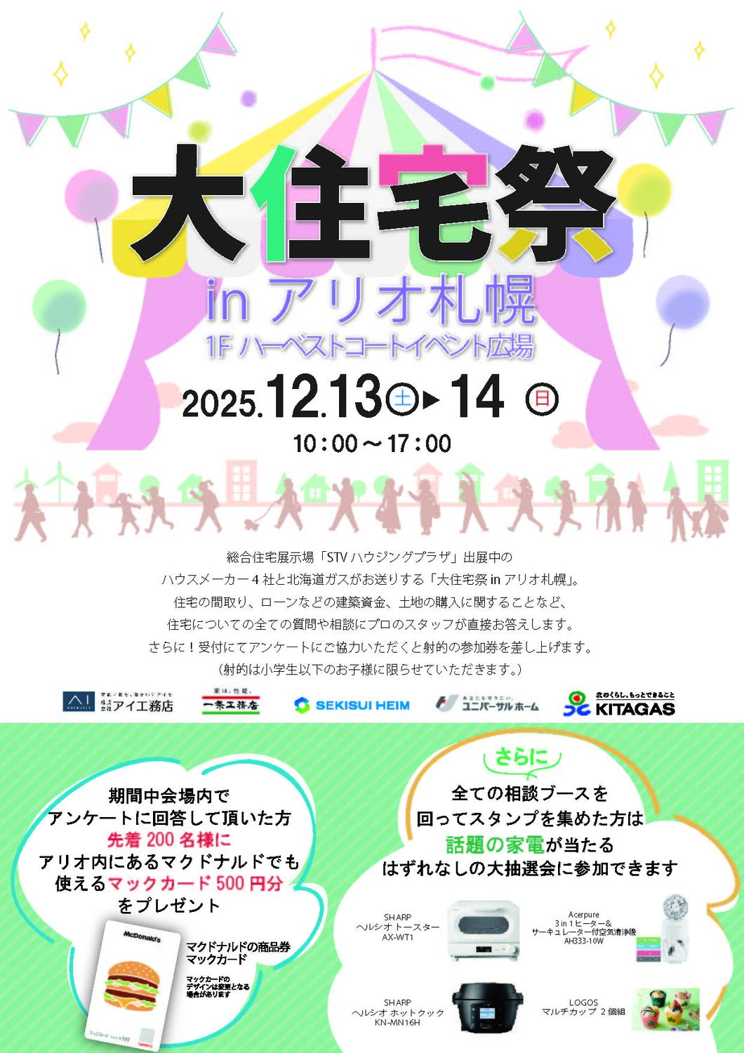 総合住宅展示場「STVハウジングプラザ」に出展中のハウスメーカー4社とエネルギー会社が住宅についての質問や相談にお答えする住宅相談会です。受付にてアンケートにご回答頂いた方2日間合計先着200名様に「マックカード500円分」をプレゼント!更に、ブースを3箇所回ってスタンプを集めた方は抽選で話題の家電が当たるはずれなしの抽選会にご参加いただけます。ぜひ1階ハーベストコートに足をお運びください。