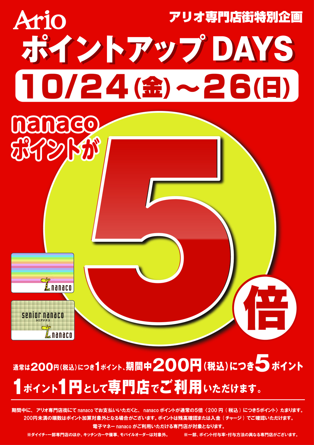 10/24(金)~10/26(日)の3日間、アリオモール専門店街でnanacoを使ってお買い物をすると、nanacoポイントが5倍!