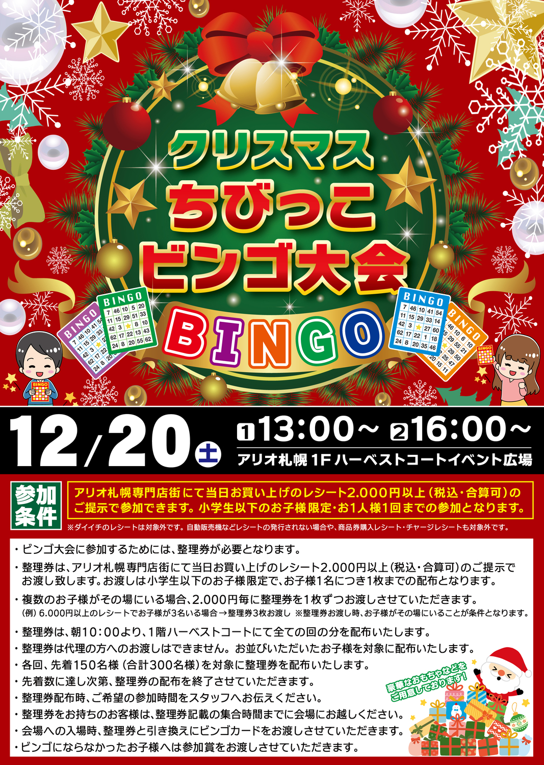 アリオ札幌専門店街にて当日お買い上げのレシート2.000円以上(税込)のご提示で参加できます。参加は小学生以下のお子様限定で、お1人様1回までとなります。