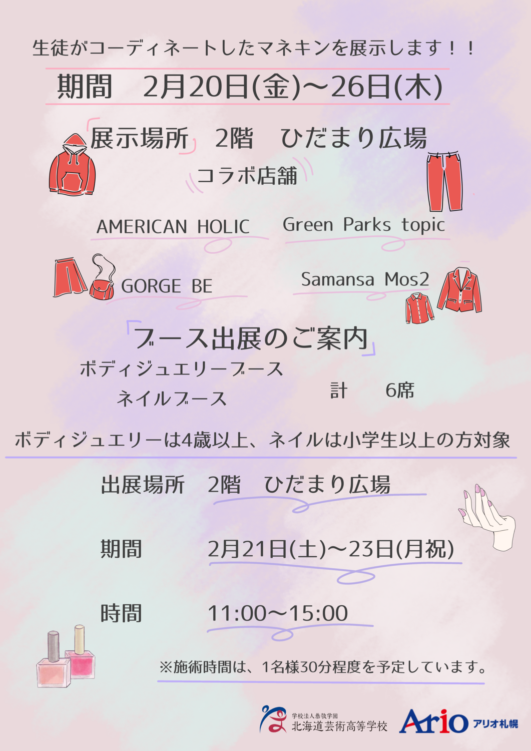 2/20(金)~2/26(木)までの7日間、アリオ札幌2階ひだまり広場にて、北海道芸術高等学校の生徒さんがコーディネートしたマネキンを展示します!