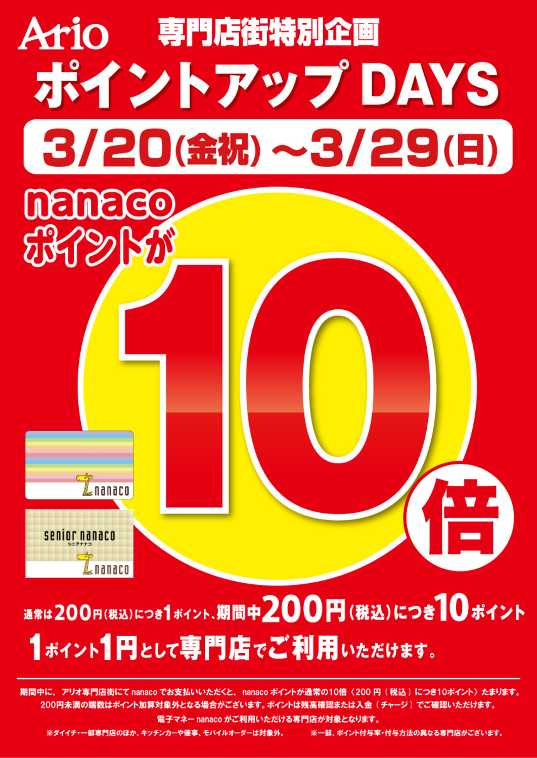 3/20(金祝)~3/29(日)の10日間、アリオモール専門店街でnanacoを使ってお買い物をすると、nanacoポイントが10倍!