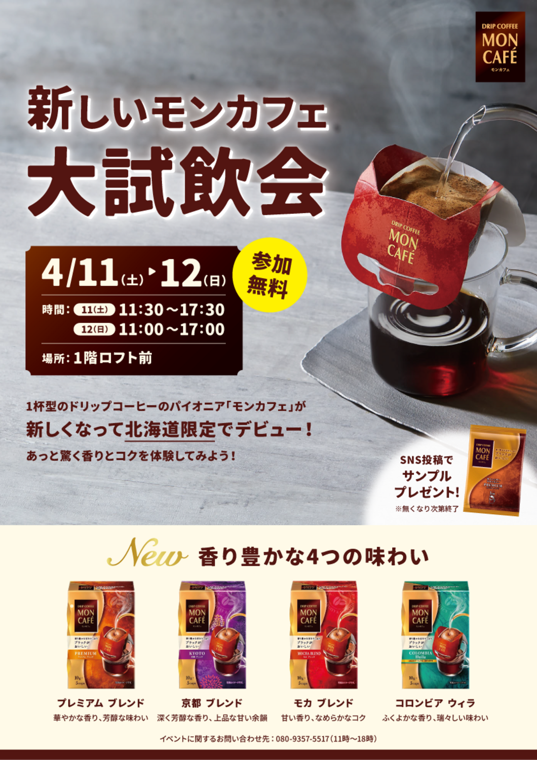 また、会場で試飲後に、SNSに投稿いただい方に、新しいモンカフェのサンプルをプレゼントします。
