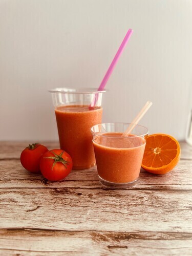 フルーツをたっぷり使った自然な甘さのスムージー。スッキリ飲みやすくビタミン補給にもぴったりです。トマトとブドウは他にはない組み合わせでブドウの甘さとトマトのさっぱり感が癖になる一杯です。