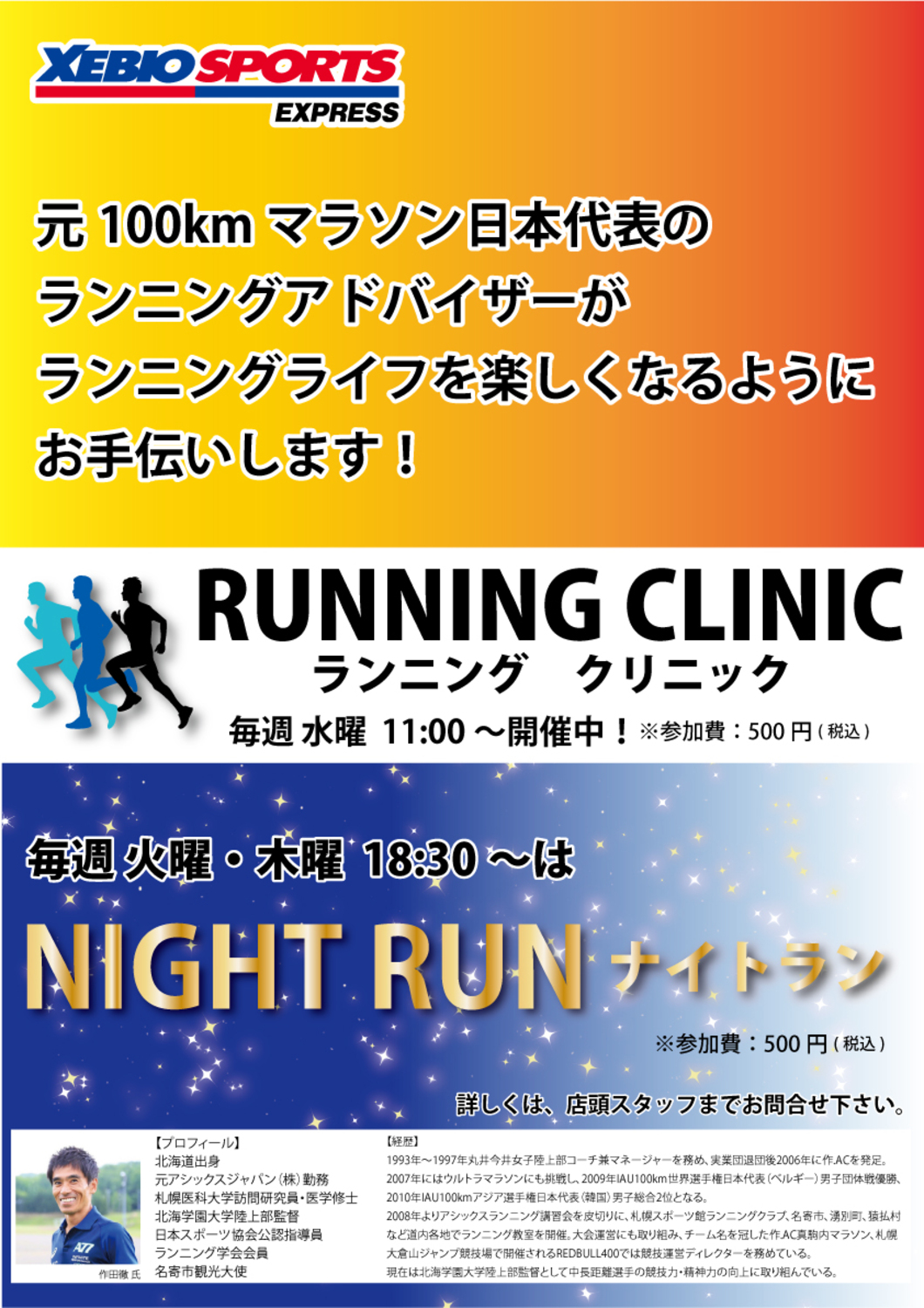元100kmマラソン日本代表のランニングアドバイザー「作田 徹氏」が講師を務めるランニングクリニックです!